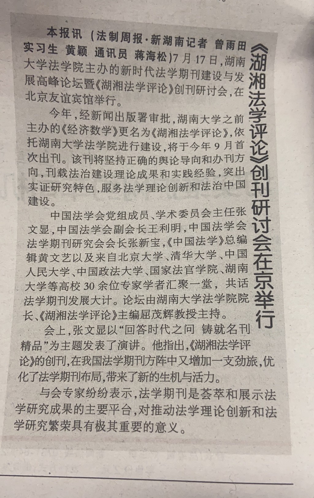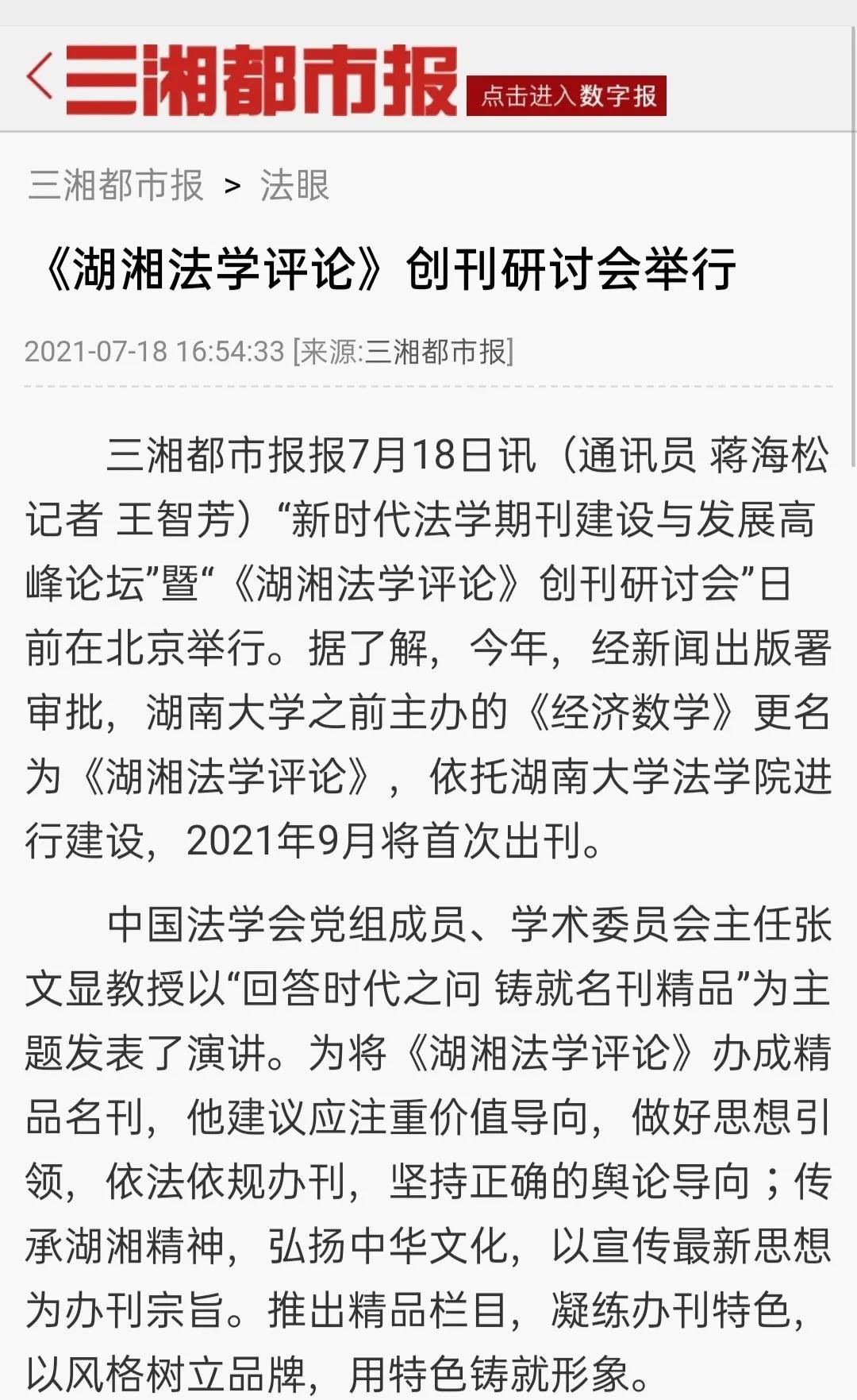 经过新闻出版署今年审批,湖南大学之前主办的《经济数学》更名为《湖湘法学评论》,该刊由教育部主管,湖南大学主办,《湖湘法学评论》编辑部负责出版发行,由湖南大学期刊社指导,依托老虎机
