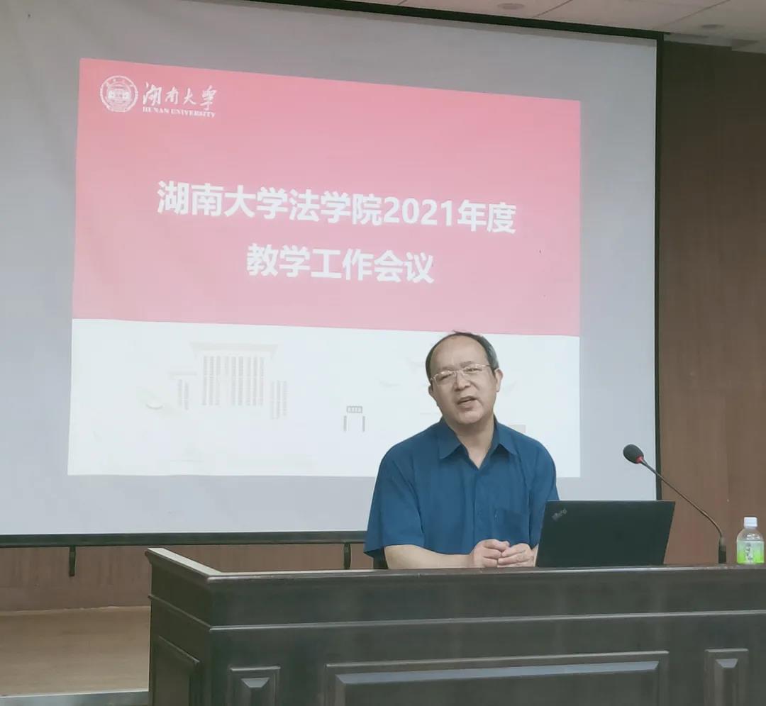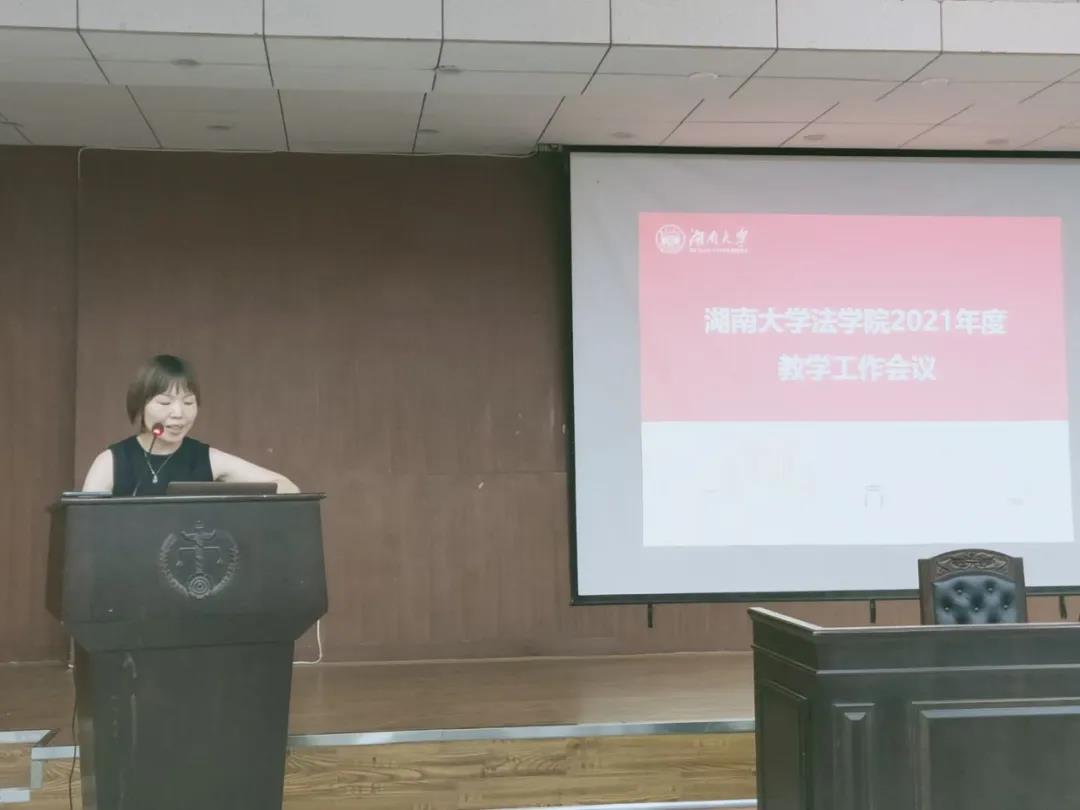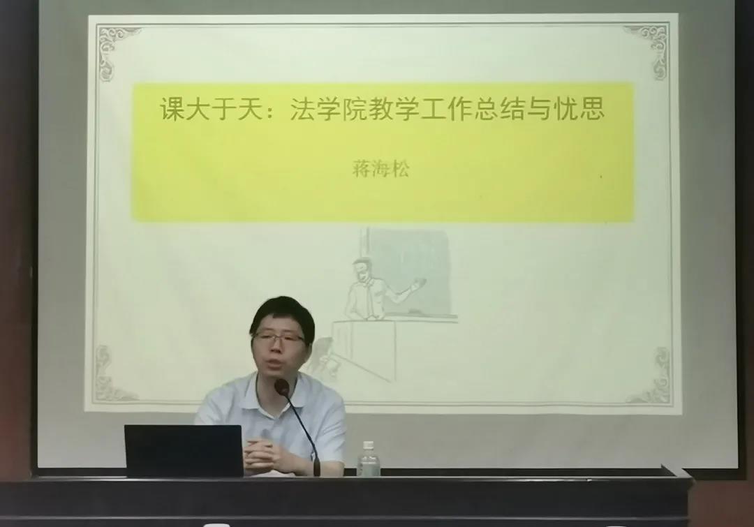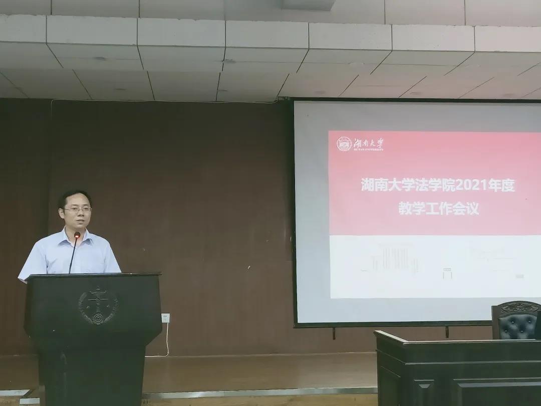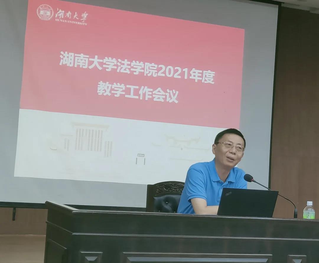 教学工作总结与反思》的专题报告。他致敬了学院各位老师投身教学,坚守讲台,对教学做出的重大贡献。他的报告分为动态与趋势、成果与亮点、困境与对策三部分。他首先介绍教学新动态新精神,如方兴未艾的新文科建设、《习近平法治思想概论》新课、我院实行新培养方案、教学比赛、课程思政、论文抽检、大创计划、一流课程建设、教学成果奖谋划等新情况。其次,总结了我院教学改革基础及亮点,如一流课程建设开局良好,已有一门国家级一流课程,三门省级一流课程;教学比赛有良好基础与经验传承,有全国教学竞赛一等奖一项,诸多省级奖项;新文科建设起点较高,获得了省级和校级新文科课题,法学与信息技术的融合成为我院改革方向;课程思政推进顺利,已有一门省级、五门校级示范课;制度保障得力,教学奖励措施到位;诸多老师热爱教学,有一批名师名课。