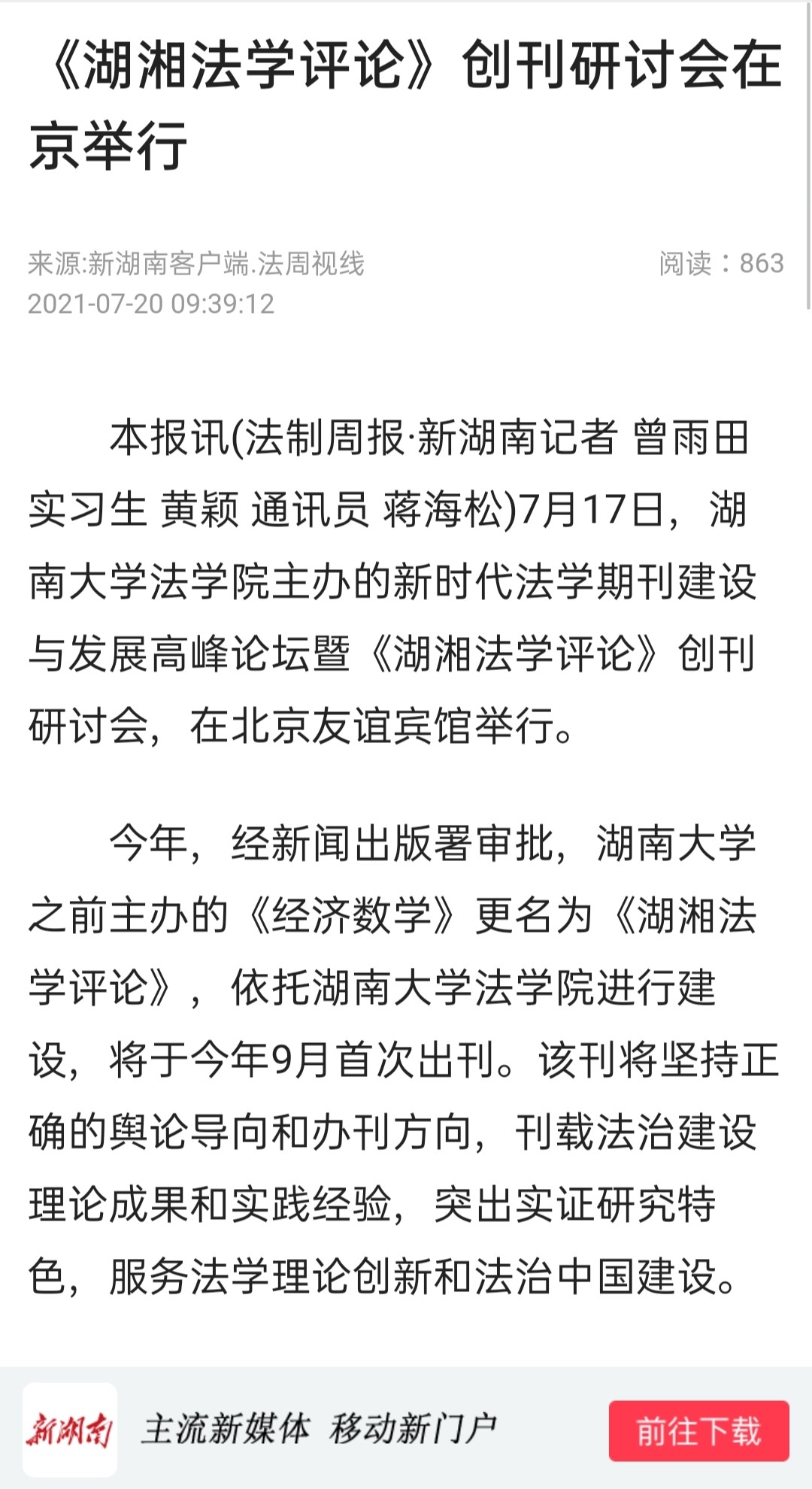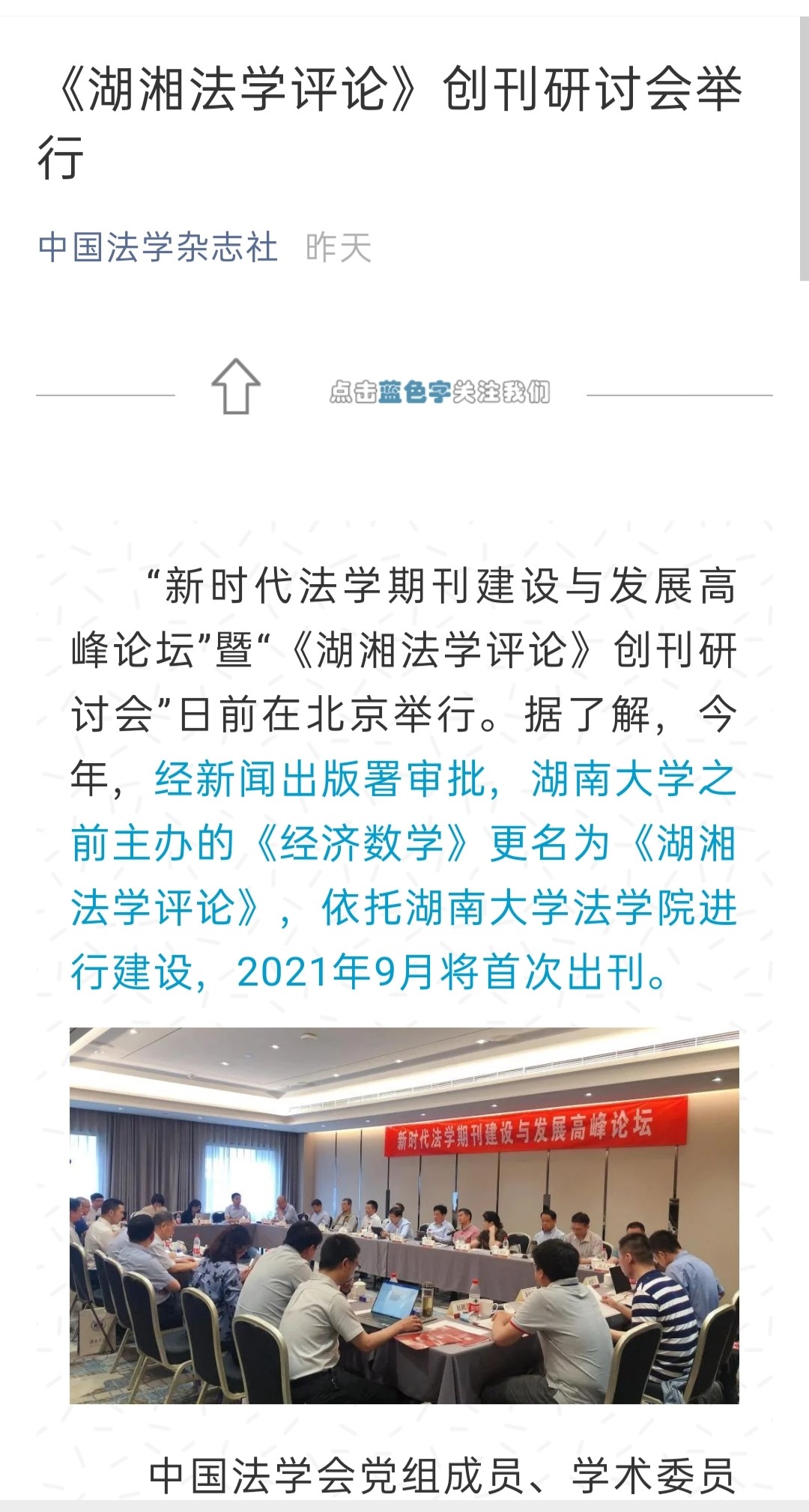 经过新闻出版署今年审批,湖南大学之前主办的《经济数学》更名为《湖湘法学评论》,该刊由教育部主管,湖南大学主办,《湖湘法学评论》编辑部负责出版发行,由湖南大学期刊社指导,依托老虎机