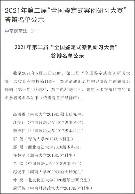 承办。2021年3月31日,第二届全国鉴定式案例研习大赛发布了竞赛题目和竞赛规则。比赛评审分为书面评审和口头答辩两个阶段。按照规则要求,参赛者于2021年5月15日前提交了参赛作品(鉴定式案例分析报告)。其后,大赛组委会组织9名评审老师对参赛作品进行了匿名评审和打分,共先后进行了初审和复审两轮评审。2021年6月11日,大赛组委会公布了入围口头答辩环节的10名参赛者名单。6月27日,组委会组织多名专家对10名参赛者逐一进行了答辩,整个答辩持续时间长达5个多小时。最终,根据参赛者的书面评审结果和口头答辩成绩,以7:3的分数比例综合确定了获奖名单。