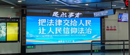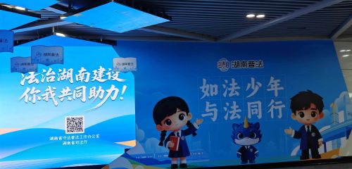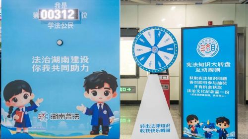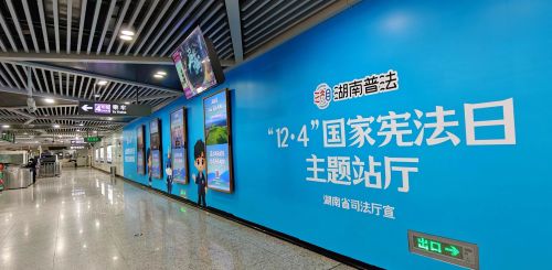 地铁站还陈列了习近平法治思想学习实践基地成果展,湖南大学基地等八个基地的宣传展板精彩亮相。
