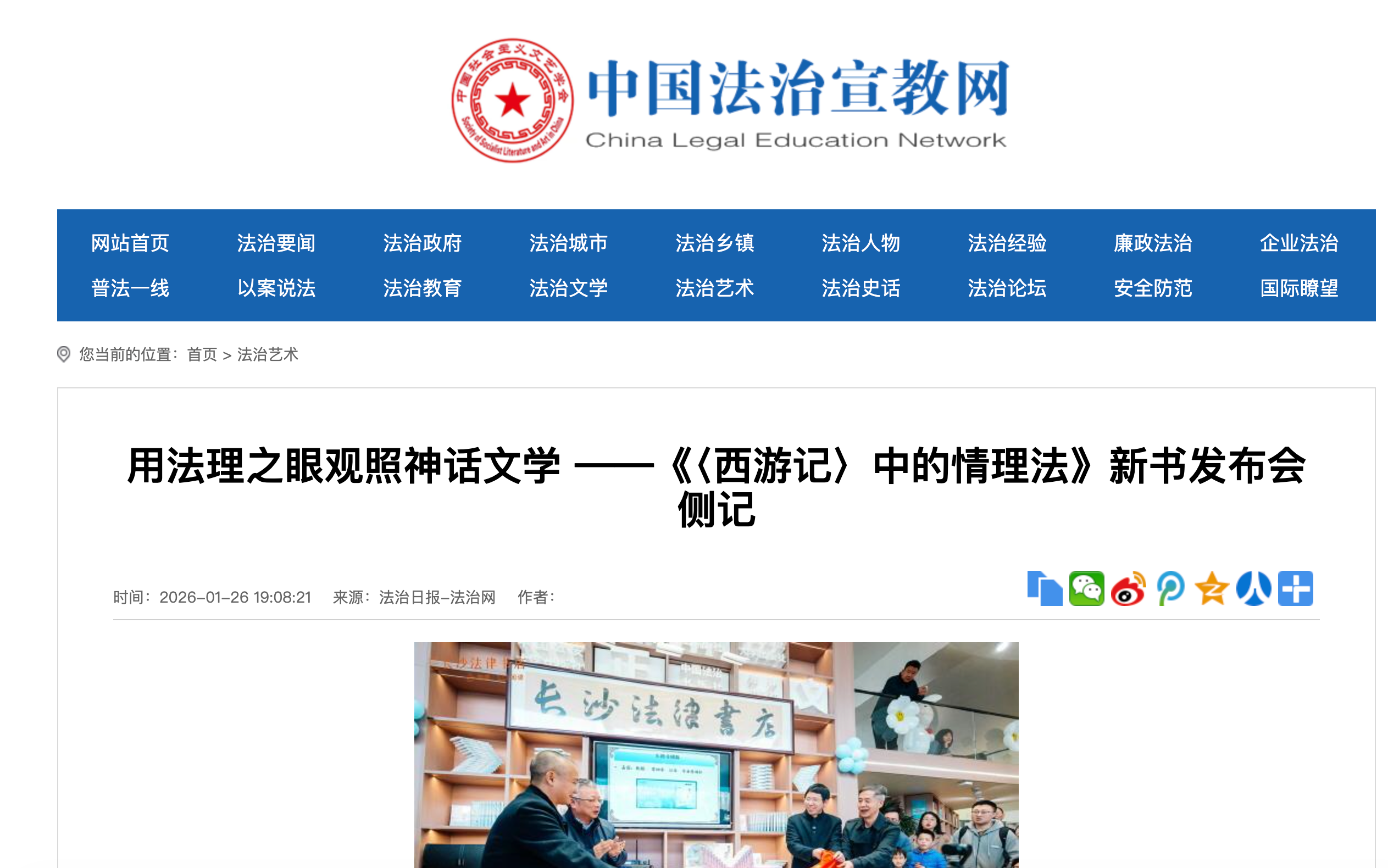1.《法治日报》2026年1月25日 报道 《用法理之眼观照神话文学——〈西游记中的情理法〉新书发布会侧记》