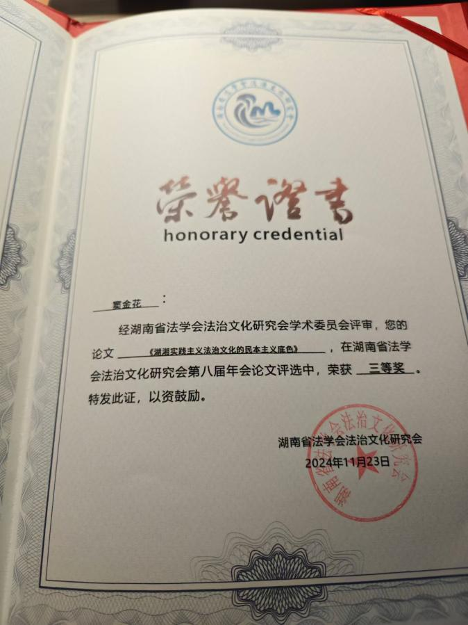 本次会议对于收到的147篇投稿论文进行了评选,并选出获奖论文35篇。其中我院研究生窦金花的论文《湖湘实践注意法治文化的民本主义底色》、本科生马文星的论文《誓的法律文化意义研究》荣获三等奖。