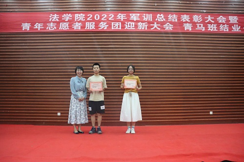 张丹老师宣读表彰决定。学院授予2022级法学三班、法学五班“军训优胜队列班级”荣誉称号,授予2022级法学一班、法学二班、法学四班“作风纪律先进班级”荣誉称号,授予天马一区三栋104寝室等十个寝室军训内务评比“优秀寝室”称号,授予刘亮、贾林远等十五人“军训先进个人”称号,授予姚睿婷、邓舒蔓等十人“青马班优秀学员”称号。学院还对参与2022级新生军训工作的迎新团队成员、老虎机