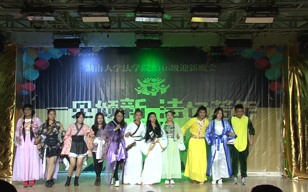 晚上七时许,晚会在充满激情与活力的开场舞《Good Boy》中拉开帷幕,同学们以昂扬的姿态放飞梦想,拥抱青春。行政管理二班的舞台剧《三个纯洁的童话故事》以搞怪的客串、精彩的表演、幽默的语言引发全场阵阵欢笑。法学三班的舞蹈串烧《千手观音》、年级会舞蹈串烧《高人指点》等节目,以动感的节奏,欢快的舞蹈,跳出了同学们的青春与活力,激情与梦想。法学五班的节目《非诚勿扰》以征婚交友为线索,配合幽默风趣的视频和语言,生动形象的表演赢得了全场阵阵掌声。法学四班的舞台剧《生死恋情》将新白娘子传奇的剧本进行了富有新意的改编,并配合现代舞蹈和音乐,加上演员们的精彩表演,使得全场观众们眼前一亮。法学三班孙兴健和林晨带来的《机场培训师》以其丰富的语言和夸张的动作表现,赢得了同学们的阵阵欢笑。法学一班的舞台剧《花千骨》充分地展示了同学们的想象力和创造力,不论是台词的设计,还是舞蹈的编排都突出了新意。在优美动人的古筝和葫芦丝乐曲中,法学四班的姑娘们手执花朵,眉眼含笑,踏歌而来,带来了清新歌舞表演《茉莉花》,舒缓典雅,落落大方,观众都沉浸在这美好的氛围中。而同样是《茉莉花》的乐曲,法学二班的同学们则带来了精美的舞蹈串烧,巧妙的将不同风格的舞蹈串联在同一个节目中,取得了很好的效果。行管一班的时装秀节目《行管一班的秘密》以动感的音乐和滑稽的表演嗨翻全场。