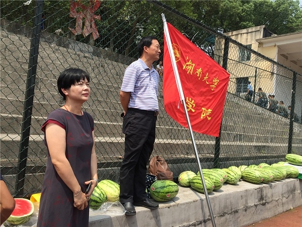 党委书记李连友、副书记付蓉芬、行政办主任湛建云、学工办主任杨锦滔和法学1604班班主任余凯老师等带着近千斤西瓜和水“犒劳”参训师生,向正在接受军训的本科新生、教官和迎新团队全体成员送去学院的慰问和关心,帮同学们消暑降温,为同学们加油鼓劲。