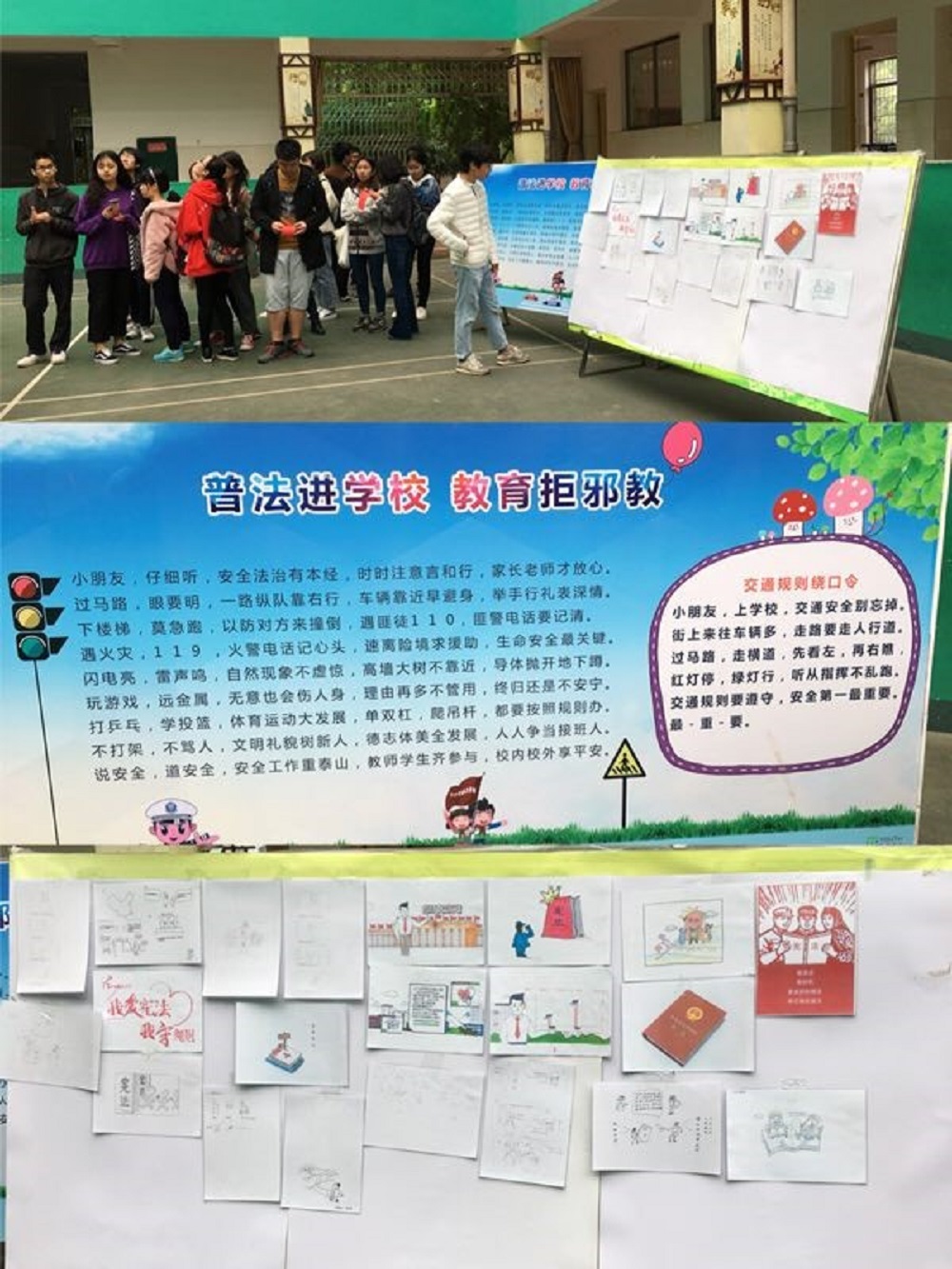 17级法本法硕党支部的代表向八字墙社区居民讲解优秀的“画说宪法”主题绘画作品和制作好的宪法宣传栏,解读宪法知识,弘扬宪法精神。宪法的精神内涵通过这些优秀的作品更加清晰透彻的表达,让社区居民和建筑学院同学们在轻松愉快的氛围中更深刻地理解宪法,从而提高社区居民和建筑学院同学们的学法、懂法、守法、用法意识,努力做宪法权威的捍卫者。