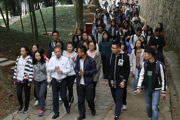 “70年前日本人的飞机轰炸长沙,轰炸岳麓书院和湖南大学,他们不会想到70年后的这片土地可以点燃奥运火炬,70年后的中国可以举办一场举世瞩目的奥运会。改革开放以来,在中国共产党的领导下我们的国家发生了翻天覆地的变化,尤其是党的十八大以来,国家在各个领域都取得了举世瞩目的辉煌成就,以习近平同志为核心的党中心提出了一系列治国理政新理念新思想新战略,指引我们国家向着中华民族伟大复习的中国梦阔步前行”。在爱晚亭后的五环树下,龙老师结合自身的感受和身边的变化向同学们阐释改革开放以来,特别是十八大以来中国在各个方面发生的变化,引发同学们的思考。同学们还在龙老师的带领下参观了国民党抗战第九战区指挥部旧址。